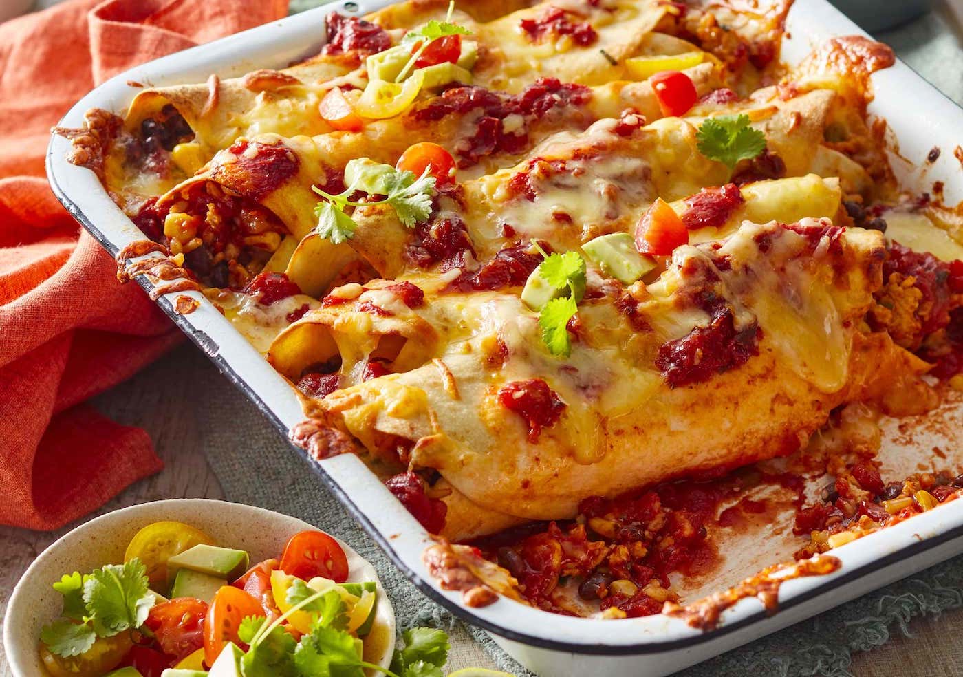 Three Cheese Enchiladas Topped with Enchiladas Sauce, Shredded Beef, Tomato, Onions, Bell Peppers, Guacamole, Lettuce and Sour Cream.